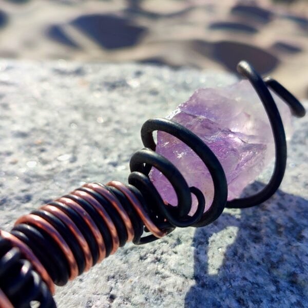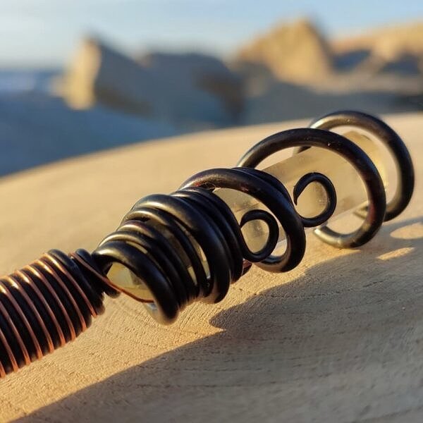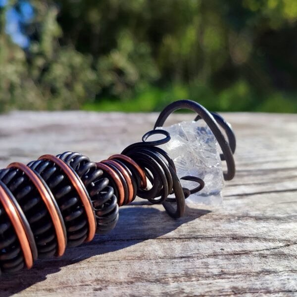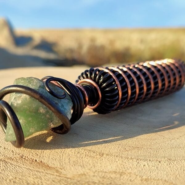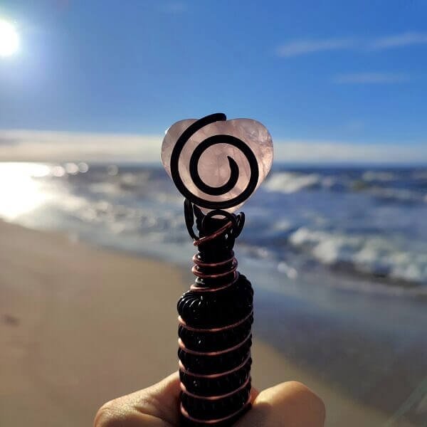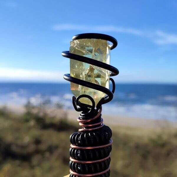 At the base of the wand lies a raw Aventurine, whose properties are amplified by the spiral structure.